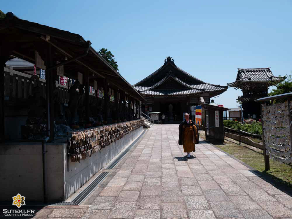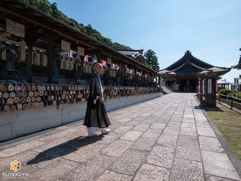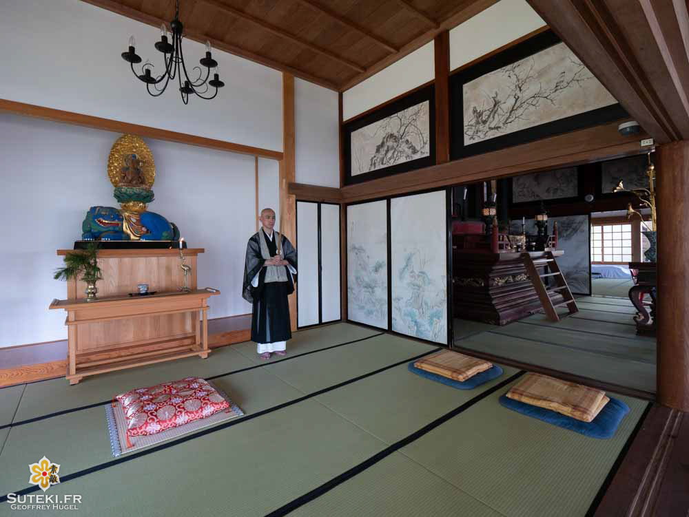 Le lendemain nous reprenons la route pour nous rendre au temple Ichibata-ji afin de rencontrer le prêtre en chef, Iizuka-san, pour une séance de zazen, la méditation assise. Brièvement cela consiste à se focaliser sur une pensée, généralement philosophique ou spirituelle. Pour cela, la position doit être rigoureusement respectée pour avoir une respiration totalement naturelle et ainsi faciliter cette pratique. Au bout d’un moment, le prêtre s’avance devant chacun de nous pour nous frapper l’épaule avec un bâton, mais ce n’est pas une punition pour qui ne médite pas correctement 🙂 Le but est de nous réveiller, de revitaliser le corps et de nous empêcher de partir trop loin dans nos pensées. Les coups sont secs et rapides, une douleur se ressent bien sûr sur le moment (plus forte que je pensais d’ailleurs), mais étonnamment elle se dissipe très vite pour laisser place à une sorte de picotement. Dans tous les cas, je confirme que ça réveille ! C’est peut-être une bonne méthode pour les matins difficiles 🙂