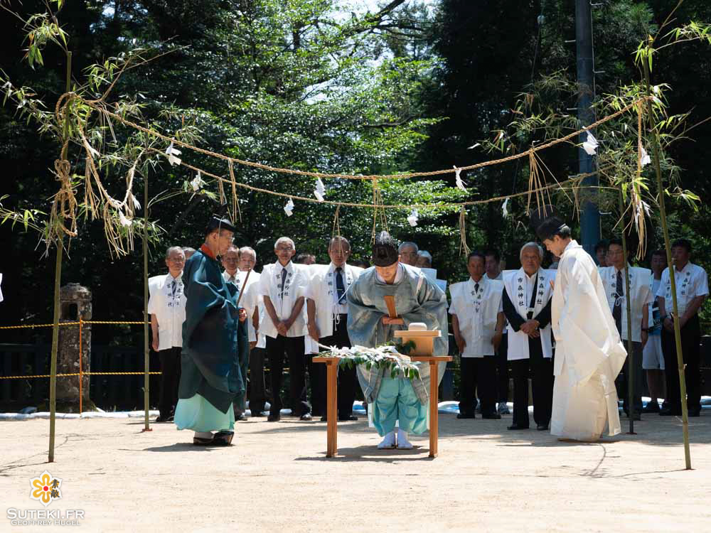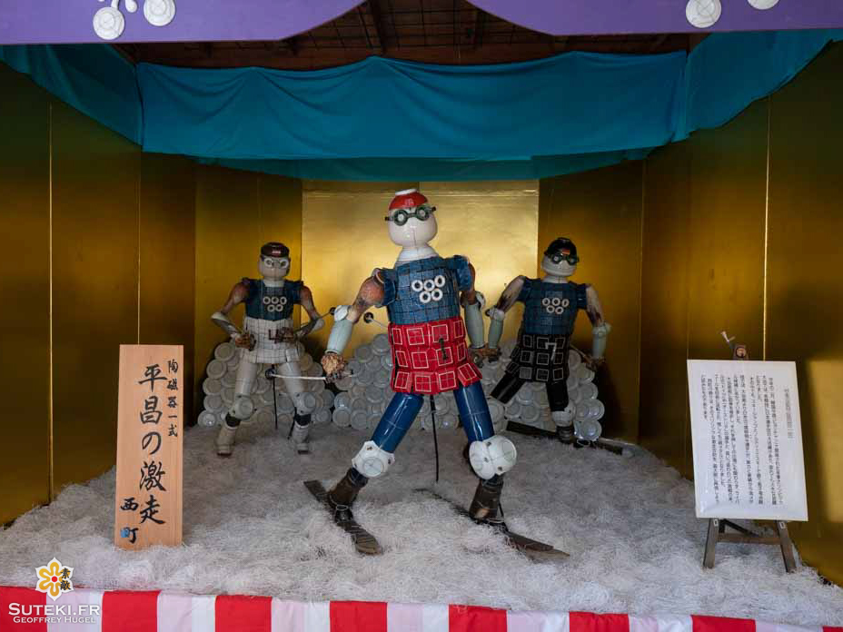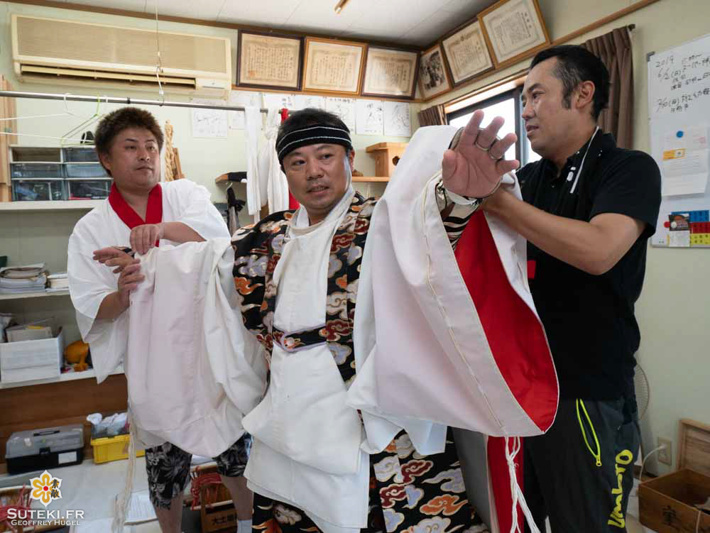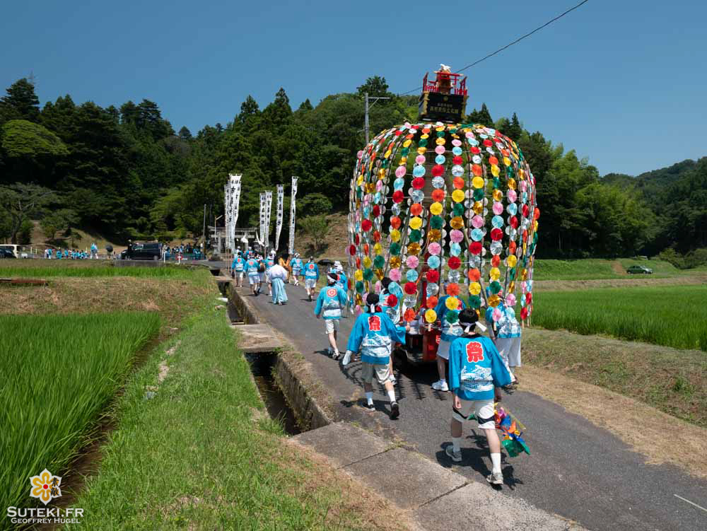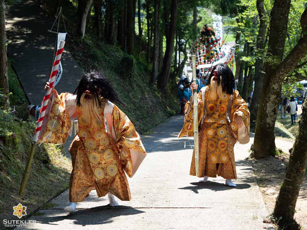 Nouvelle étape, à la découverte d’un matsuri au sanctuaire Ichimori Jinja, avec notamment une procession de deux démons qui effrayaient les spectateurs, un petit mikoshi porté (poussé) par des enfants, et une étrange structure… motorisée ! Et il valait mieux vue la pente pour atteindre le hall principal ! Là encore nous avons pu échanger avec quelques locaux ainsi qu’avec le prêtre principal du lieu.