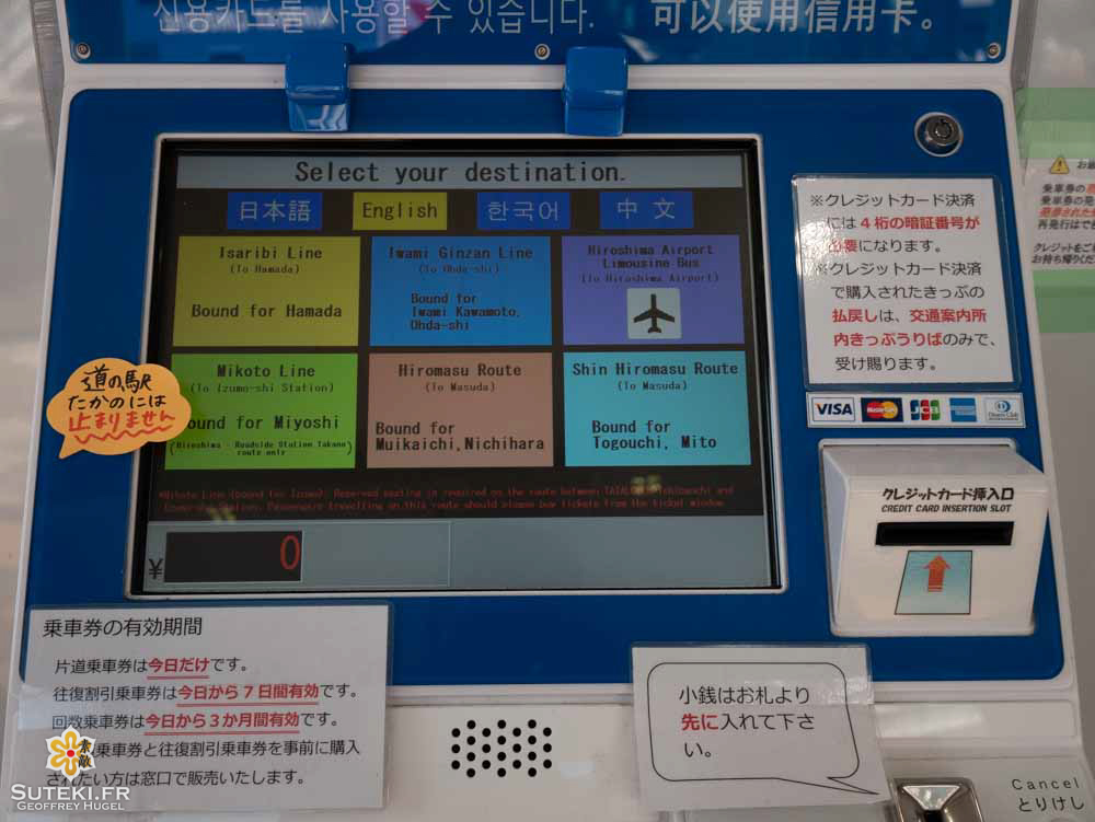 Il y a pas mal de façons de se rendre à Izumo : train (de jour ou de nuit), avion ou encore bus, c’est pour cette dernière option que j’ai opté depuis Hiroshima, puisque j’étais de très bref passage dans la région pour voir le copain Yann (@loeildutako). Comptez trois heures de trajet tout de même mais il y a de jolis paysages en chemin donc ce n’était pas inintéressant ! Il en coutera 4100 yens pour l’aller ou 7.400 yen l’aller-retour avec le JR Chugoku Bus.