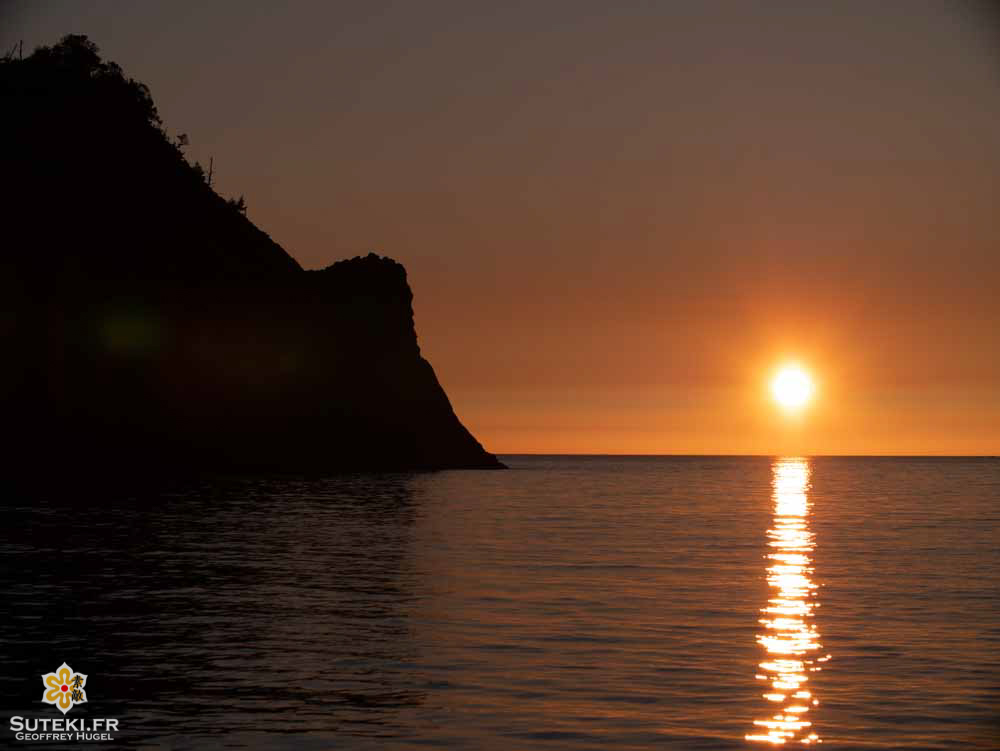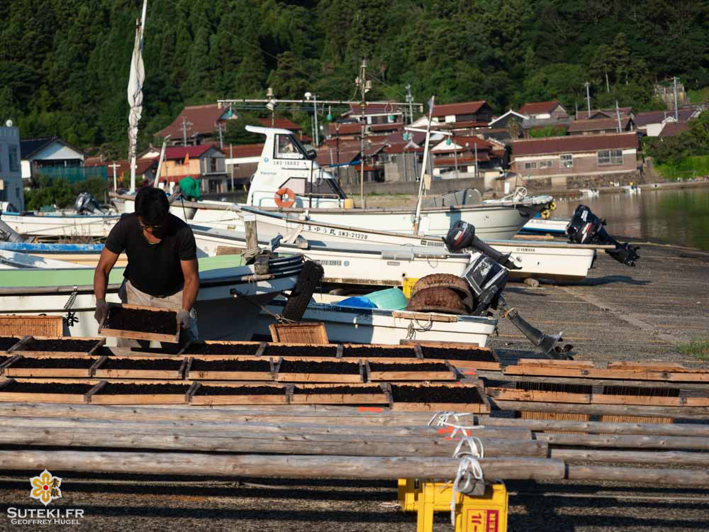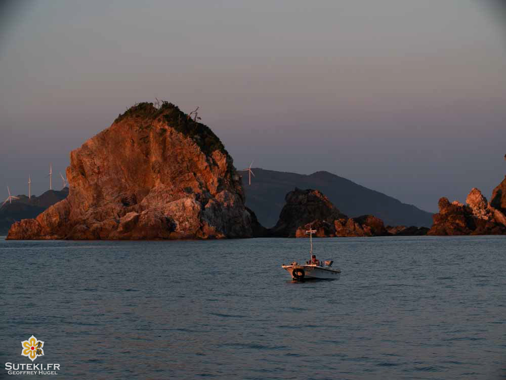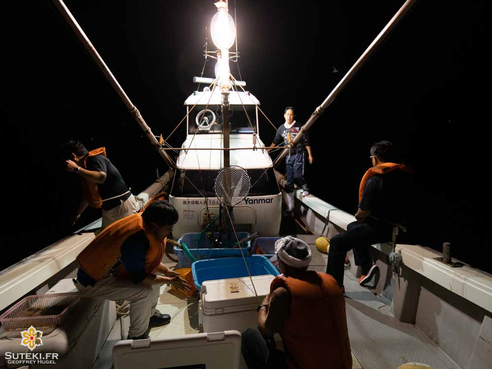 La journée n’est toujours pas terminée, il nous reste encore à se rendre dans un petit village de pêcheurs, où nous dinerons et dormirons, mais surtout pour embarquer sur un bateau avec Abe-san, le chef du village, afin d’aller attraper des calmars en mer à la nuit tombée ! Accessoirement, le simple coucher de soleil, avec ce dernier qui sort d’un coup de derrière les rochers, valait le déplacement. Bref, armés d’un simple fil et d’un hameçon, il suffit de le remonter et de le redescendre jusqu’à ce que ça morde. Évidemment plus facile à dire qu’à faire ! Le démarrage est difficile et les premières prises se font attendre mais à l’arrivée la pêche a été plutôt correcte visiblement.