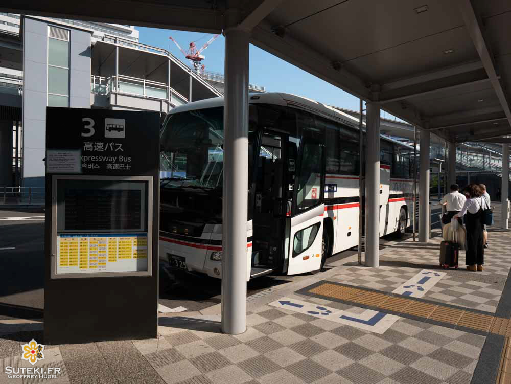 Le bus en question est au nord de la gare de Hiroshima, du côté du Shinkansen. Il suffit de descendre les escaliers, de prendre un ticket au distributeur ou au guichet, et de vous rendre au quai numéro 3 !!