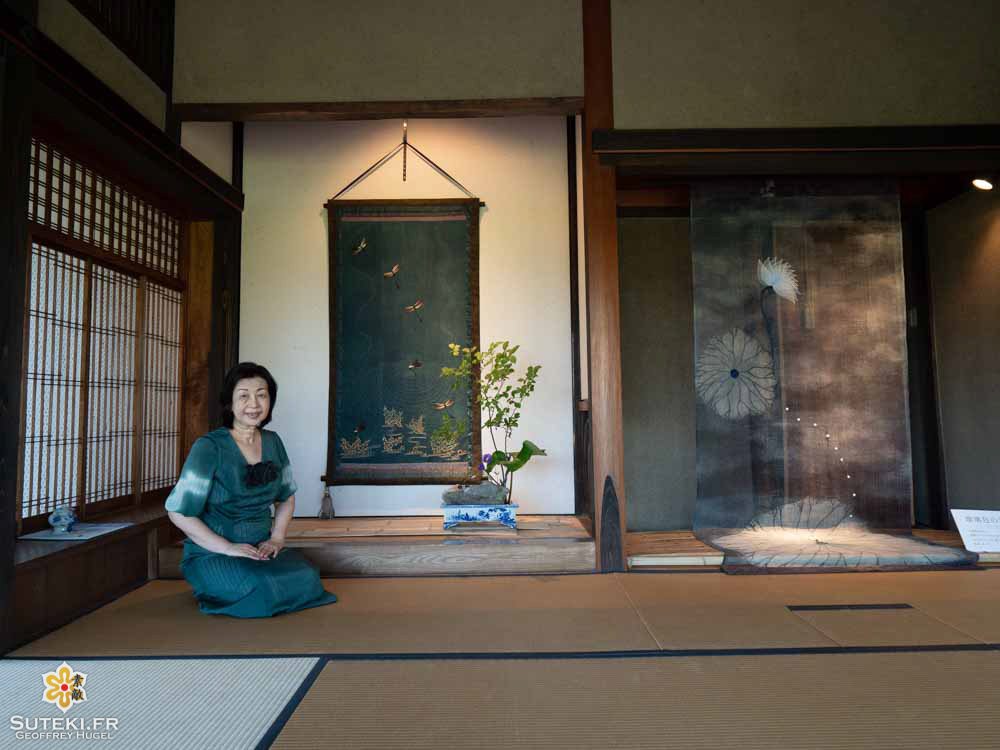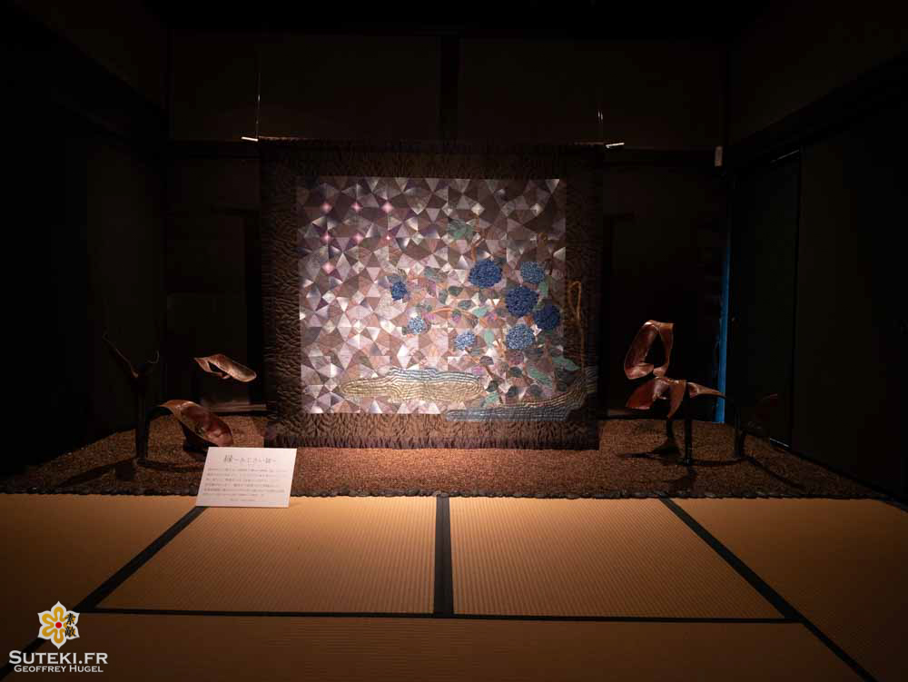 Direction ensuite le Izumo Museum of Quilt Art, une ancienne demeure familiale rénovée par Mutsuko Yawatagaki. Madame est une artiste qui créé des courtepointes, sortes de couvertures décoratives, notamment à partir de kimono vintage. Mais se limiter à ses créations serait une erreur, tout le lieu est en réalité une exposition, saisonnière, où le sens du détail se ressent dans chaque recoin de la bâtisse. Antiquités, compositions florales, éclairages subtils, etc… C’est raffiné partout où l’on pose les yeux. Et puis pour rajouter au charme de l’endroit, dégustation d’un petit thé vert avec la bonne pâtisserie qui va bien !
