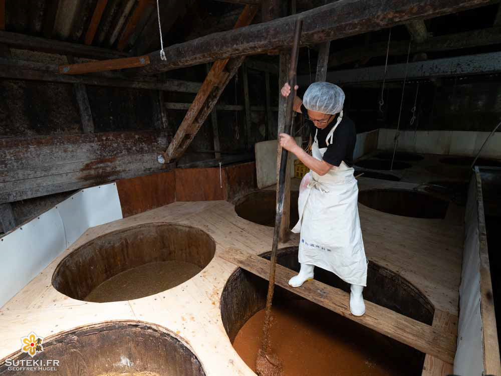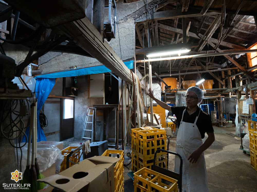 Changement d’ambiance pour visiter une authentique fabrique familiale de sauce soja, vieille de 150 ans, avec son propriétaire actuel, Oka-san. Petite dégustation de différentes déclinaisons pour commencer, avant de voir les énormes cuves en bois où la fermentation se fait. Pas le droit se s’approcher trop près pour ne rien laisser tomber dedans, mais c’est vraiment intéressant à voir. Ce n’était pas ma première fabrique du genre mais je n’avais pas pu rentrer dans ces parties, c’est donc maintenant chose faite 🙂 Et pour finir, je n’ai pas pu m’empêcher de leur acheter quelques bouteilles, tant qu’à faire !