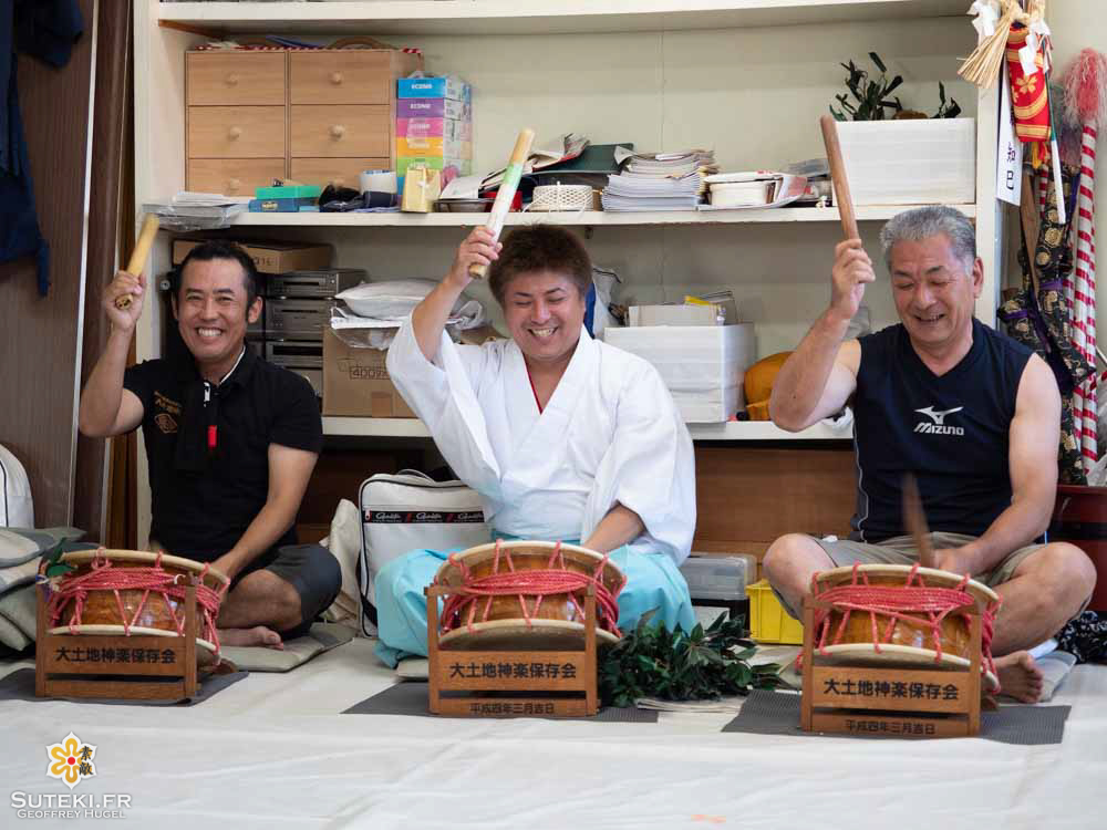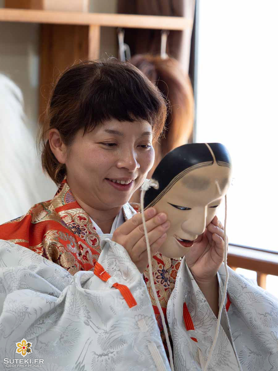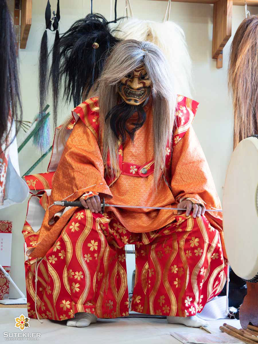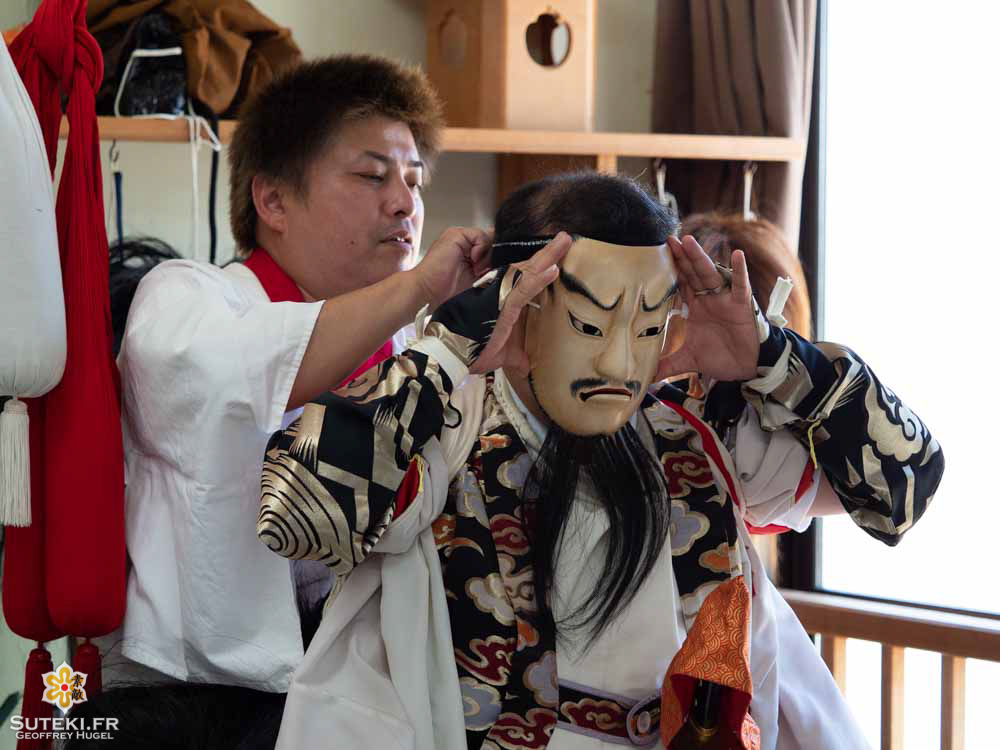 Tout s’enchaine décidément très vite et nous voilà déjà dans un autre endroit, avec de nouvelles rencontres ! Cette fois-ci il s’agit de Izumo Kagura, une danse théatrale sur de thème de l’amour ou encore des batailles entre dieux, et qui est intimement connectée aux origines de la région. Il faut déjà s’y mettre à deux ou trois pour habiller chaque acteur des multiples couches de vêtements, et des superbes masques qu’ils doivent porter. La répétition n’a pas commencé mais je les plains déjà car il fait très chaud dans la pièce… Et sans surprise, c’est encore plus chouette une fois en mouvement, avec la musique, les percussions, et toute la gestuelle de l’ensemble. C’est déjà impressionnant mais j’aurai voulu voir ça sur scène du coup ! Voeu à moitié réalisé avec le DVD généreusement offert, merci à eux, j’en demandais pas tant !