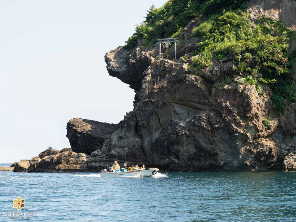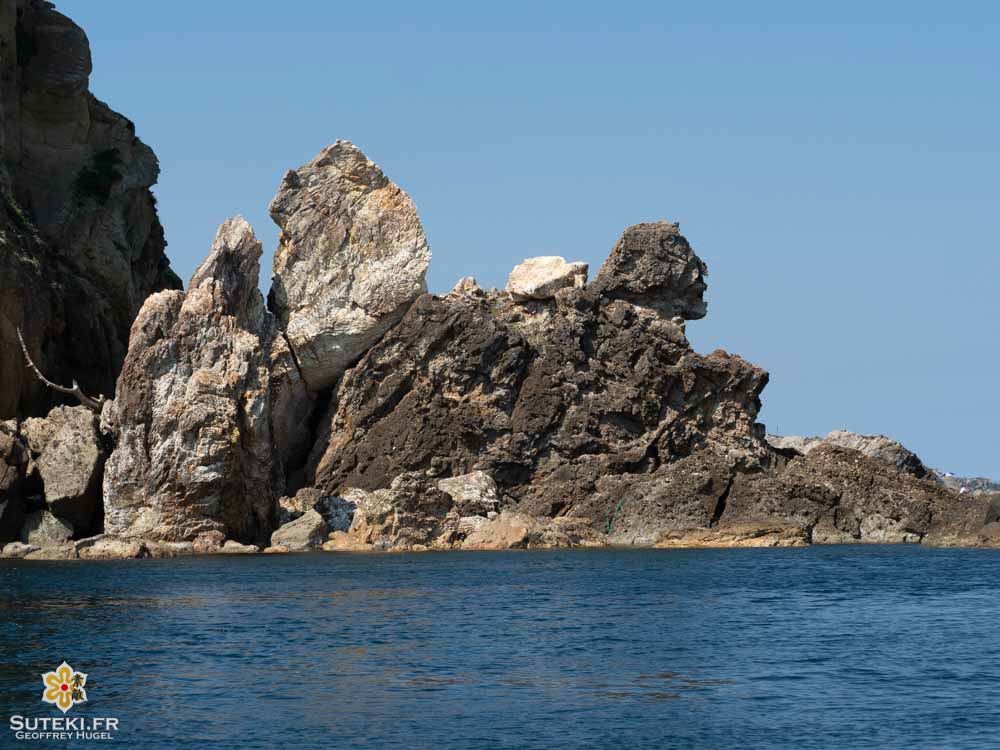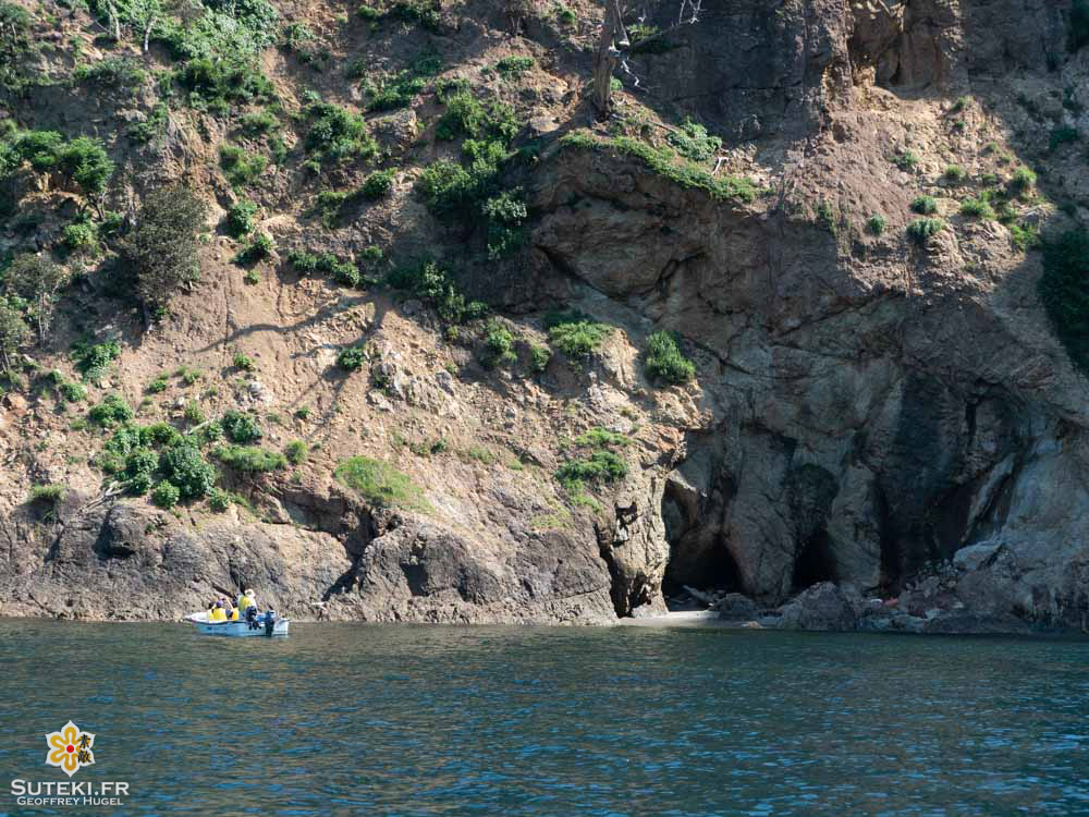 Déjà la troisième et dernière journée du séjour mais il reste tant à faire ! Après une petite balade solitaire, nous reprenons la mer, toujours avec Abe-san pour une excursion dans la baie avec quelques rochers amusants en forme de nez de cochon ou de sphinx, et surtout quelques cavernes à l’eau turquoise et transparente. Superbe.