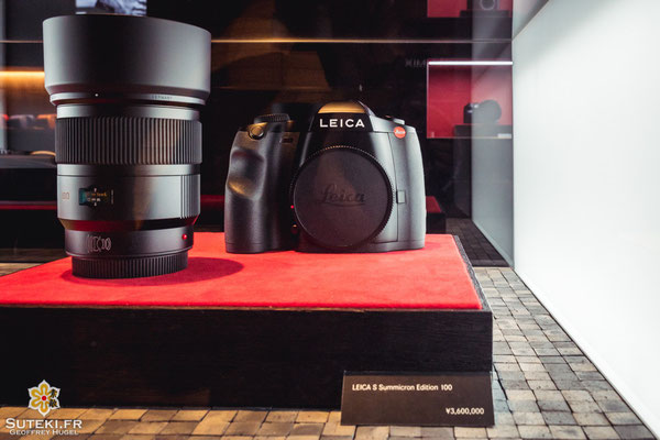 A l’intérieur, c’est classe, sobre, minimaliste, moderne mais l’ensemble garde aussi certains éléments qui font le charme d’une machiya comme le petit jardin intérieur au fond de la boutique. En un mot, superbe. Les produits sont bien mis en valeur, et moi qui les connait peu, je suis surpris de voir que la gamme est assez large. J’ignorais par exemple l’existence d’un gros reflex qui est notamment équipé d’un capteur moyen format (encore plus grand que les capteurs « plein format » des appareils professionnels du type Canon 5D), ce qui le rend… particulièrement inaccessible (~26.000€) et surtout réservé à un usage vraiment spécifique (publicité notamment).