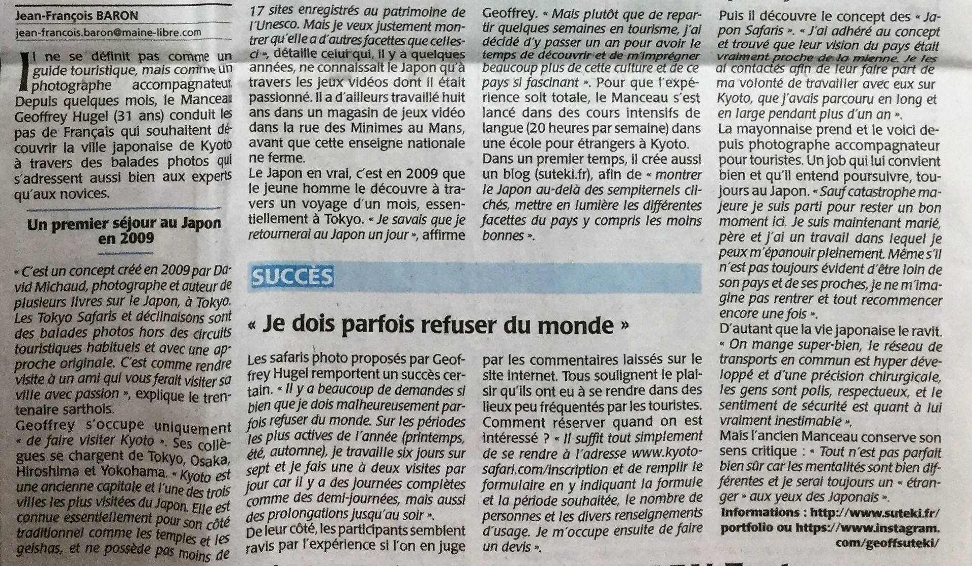 Après avoir eu un article sur moi dans le magazine Japan Lifestyle (décembre 2015), j’ai eu le droit à un autre papier en 2016, cette fois ci dans le journal local Le Maine Libre. Ca y parle des Kyoto Safari et bien sûr de moi-même, ou comment un sarthois « a réussi » au pays du soleil levant.